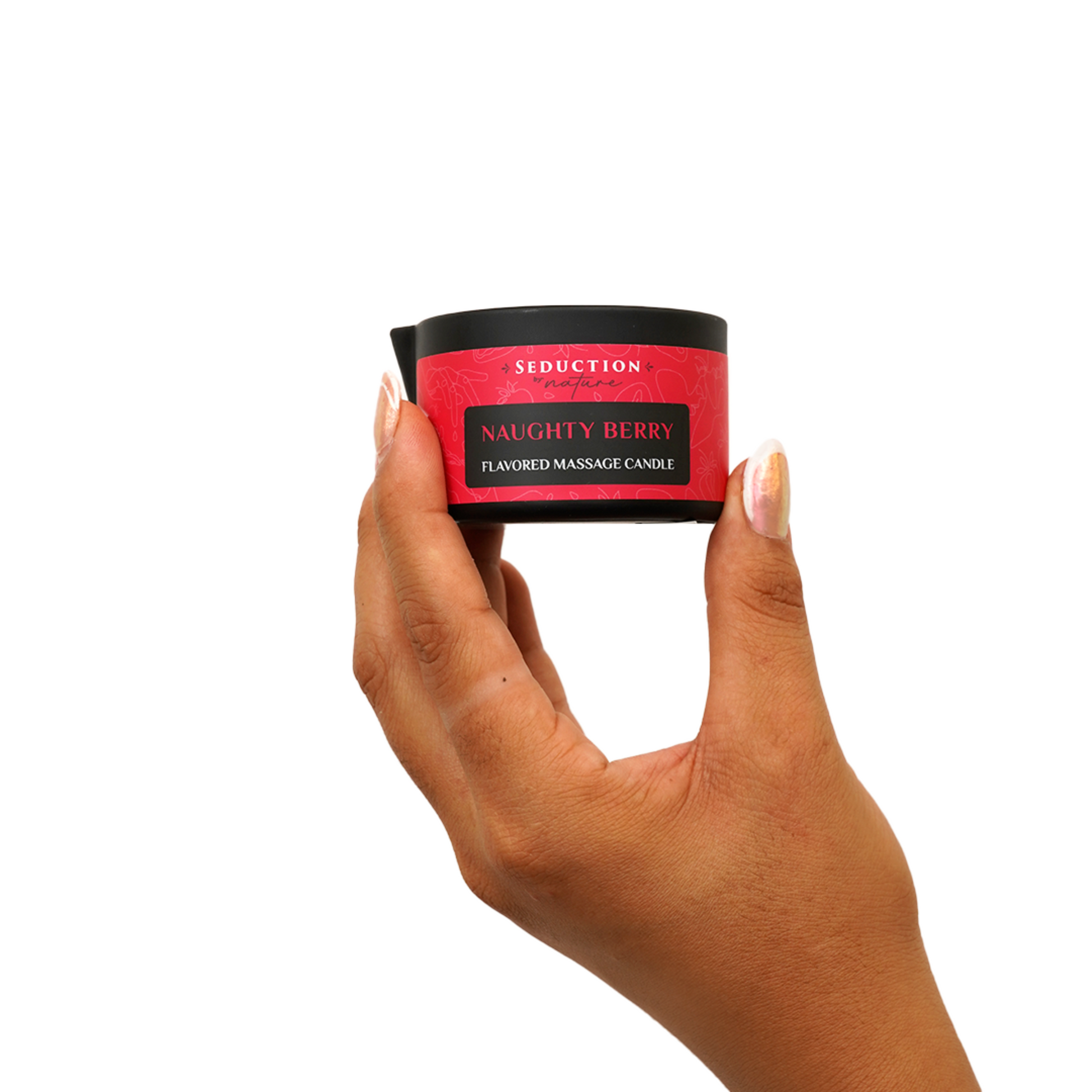 Set the mood for playful seduction with our Naughty Berry Edible Massage Oil Candle. This tempting 2-in-1 candle melts into a warm, silky massage oil with a juicy berry flavor that tastes as good as it smells. Light it up to fill the room with a deliciously flirtatious aroma, then pour the nourishing oil onto the skin for a sensual, kissable massage experience. Perfect for igniting passion and pampering the body. Safe for all skin types, edible, and irresistibly naughty.